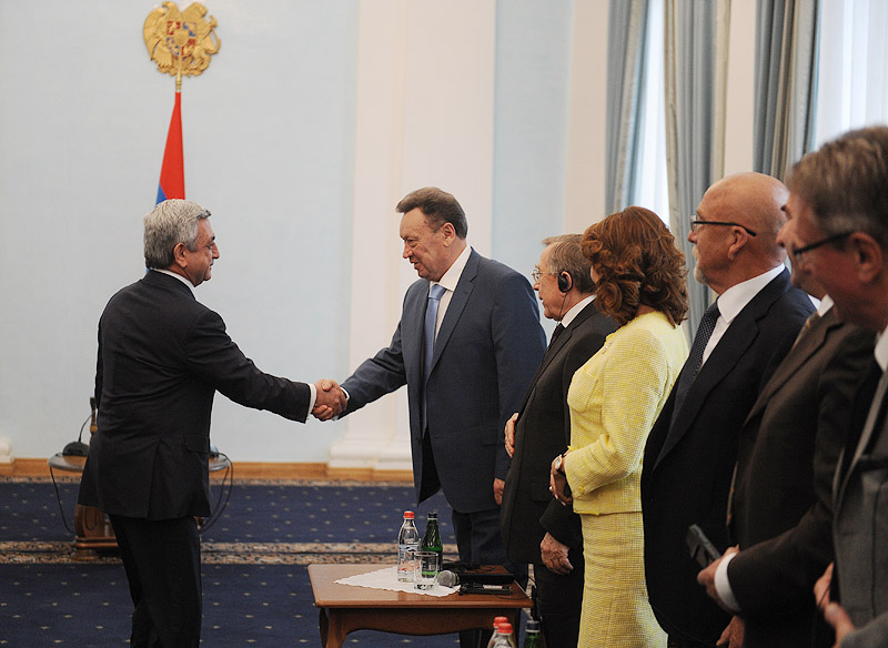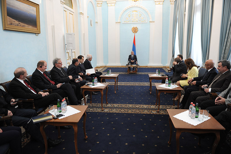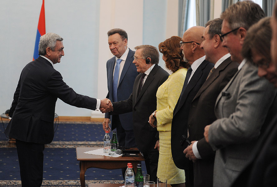 Նախագահ Սերժ Սարգսյանն այսօր ընդունել է Երևանի պետական համալսարանի իրավագիտության ֆակուլտետի 80-ամյակին նվիրված միջոցառումների շրջանակներում անցկացվող «Իրավական կարգավորման կատարելագործման արդի հիմնախնդիրները. ազգային և միջազգային իրավական ասպեկտները» միջազգային գիտաժողովի մասնակիցներին: Գիտագործնական այդ միջոցառմանը մասնակցում են «Իրավաբանների միջազգային միության» և «Գերմանիայի դաշնային գերագույն դատարանի դատավորների և դատախազների ընկերակցության» պատվիրակությունները, որոնց կազմում ընդգրկված են վաստակավոր իրավաբաններ, ակադեմիկոսներ, դատավորներ և դատախազներ: