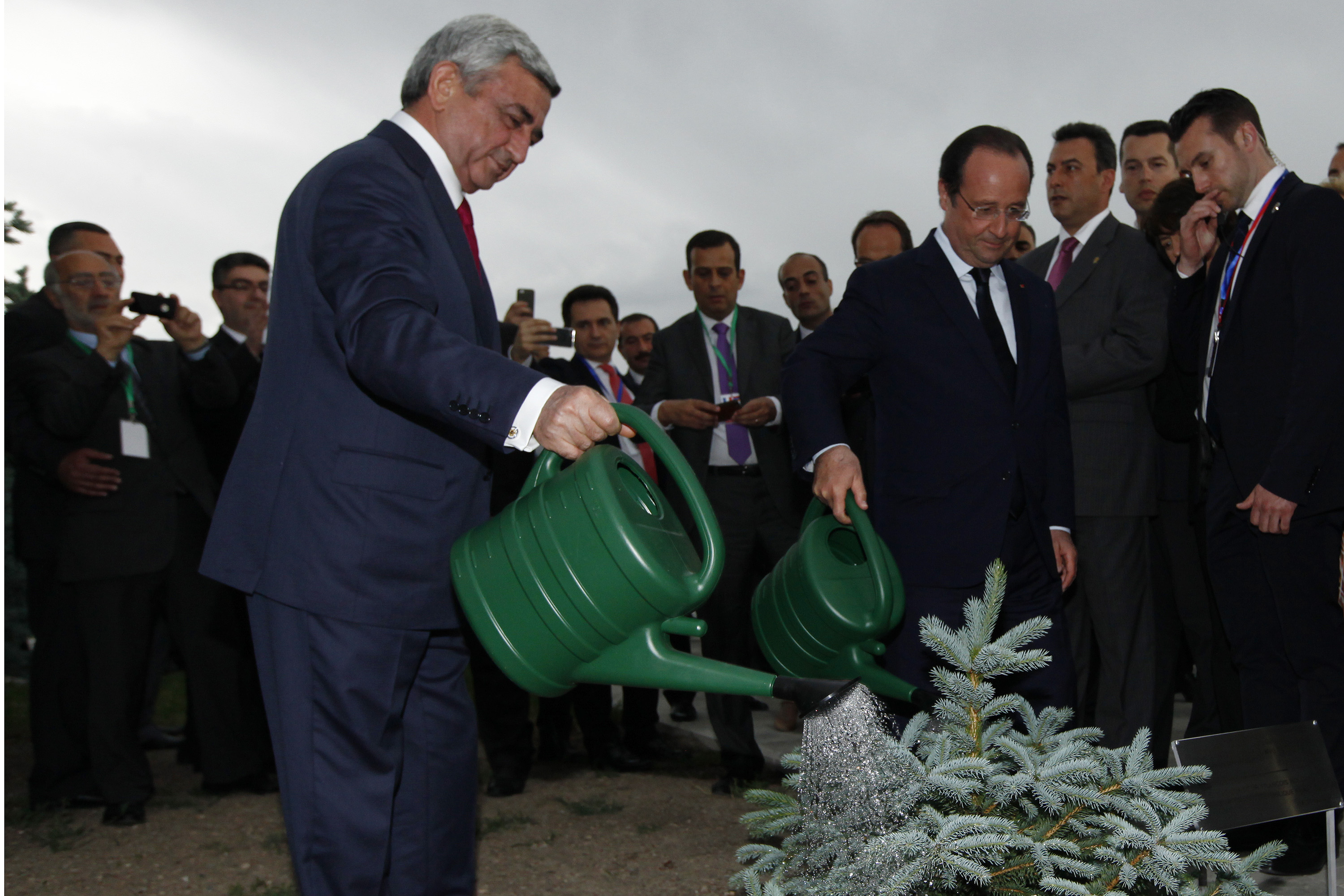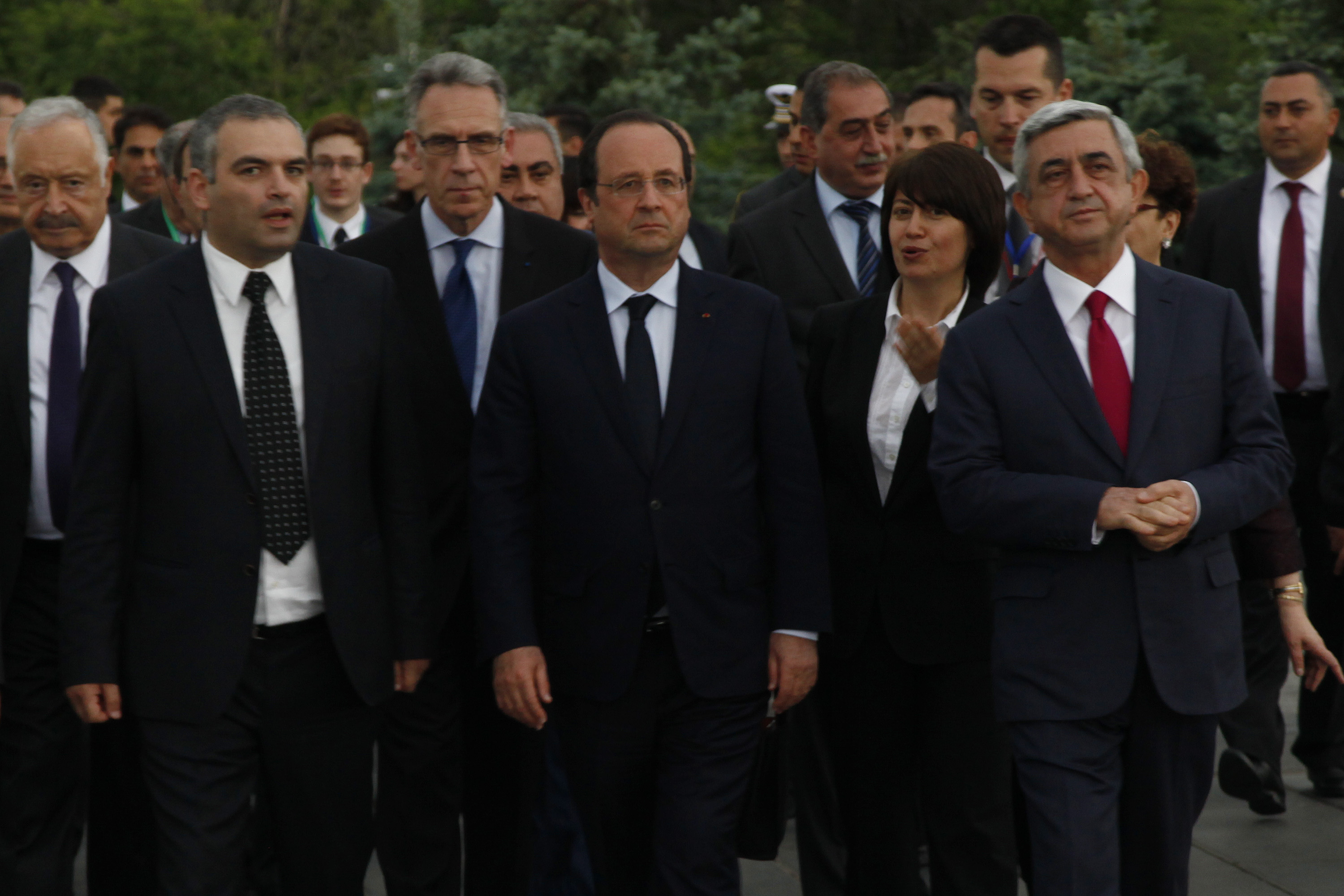 Նախագահ Սերժ Սարգսյանը և պետական այցով Հայաստանի Հանրապետություն ժամանած Ֆրանսիայի Նախագահ Ֆրանսուա Օլանդն այսօր այցելել են Ծիծեռնակաբերդի հուշահամալիր, ծաղկեպսակ դրել Հայոց մեծ եղեռնի զոհերի հուշարձանին, ծաղիկներ խոնարհել Հայոց ցեղասպանության զոհերի հիշատակը հավերժացնող անմար կրակի մոտ: Ֆրանսիայի Նախագահը նաև եղևնի է տնկել հուշահամալիրի Հիշողության պուրակում: