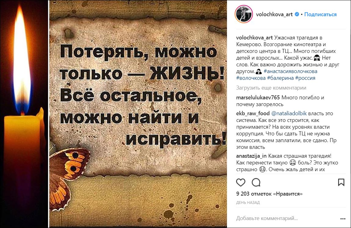 «Ամբողջ երկիրը սգում է մեծ վիշտը, չէ որ Կեմերովոյում մարդիկ են ողջ–ողջ այրվել, իսկ Վոլոչկովան կարծես նույնպես անմասն չի մնում, ցավակցական հրապարակումներ է անում, կոչ է անում իշխանություններին չթաքցնել զոհերի ճշգրիտ թիվը, իսկ հետո՝ պարեր, ուրախություն, զվարճանք»,– գրել է պարուհու երկրպագուներից մեկը։