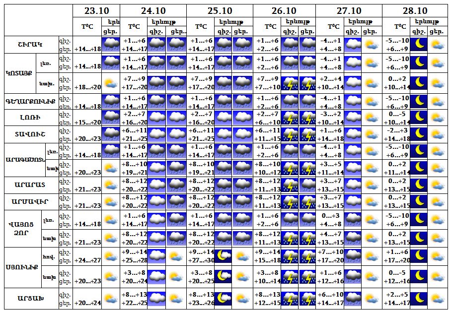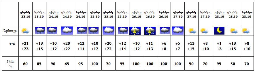 Հոկտեմբերի 24-25-ը՝ հատկապես կեսօրից հետո, սպասվում է կարճատև անձրև: Հոկտեմբերի 26-ին ժամանակ առ ժամանակ սպասվում է անձրև և ամպրոպ, ամպրոպի ժամանակ սպասվում է քամու ուժգնացում` 15-20 մ/վ։ Հոկտեմբերի 27-28-ը սպասվում է առանց տեղումների եղանակ։