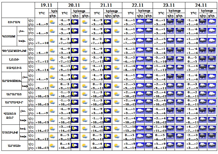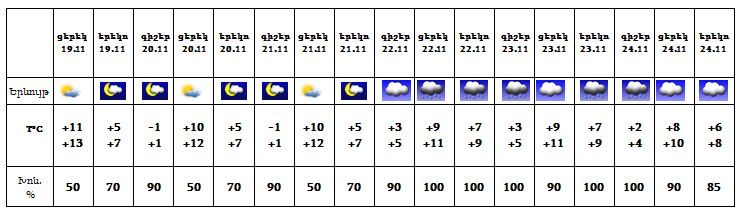 Նոյեմբերի 19-ի ցերեկը, 20-21-ը սպասվում է առանց տեղումների եղանակ, 22-24-ը սպասվում է անձրև: