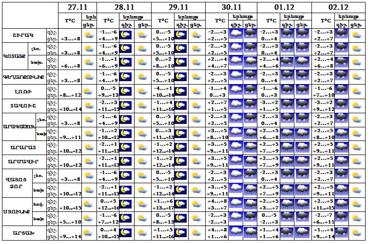Քամին՝ հարավ-արևմտյան` 3-8 մ/վ: Օդի ջերմաստիճանը նոյեմբերի 27-29-ի ցերեկը, 30-ի գիշերը կբարձրանա 3-4 աստիճանով, նոյեմբերի 30-ի ցերեկը, դեկտեմբերի 1-ին կնվազի 4-5, Լոռիում, Տավուշում, Սյունիքում և Արցախում` 10-12 աստիճանով: