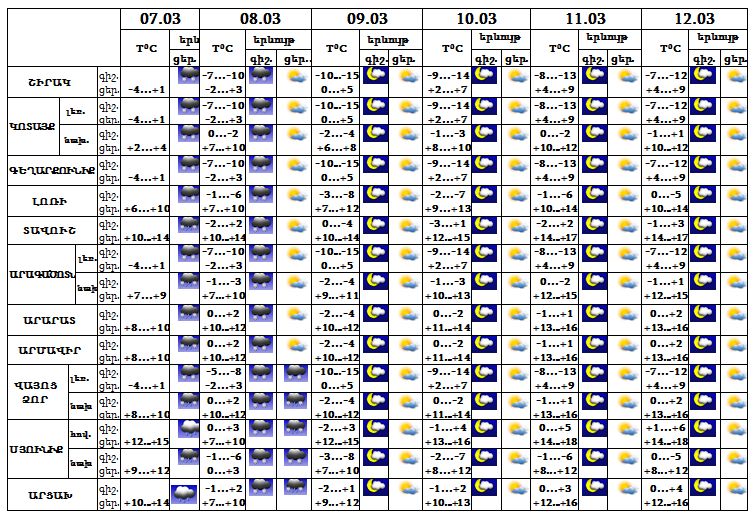 Մարտի 8-ի գիշերը շրջանների զգալի մասում, 8-ի ցերեկը Վայոց ձորում, Սյունիքում և Արցախում սպասվում են տեղումներ, լեռնային և նախալեռնային շրջաններում` ձյան, հովտային շրջաններում` անձրևի տեսքով: Մարտի 9-12-ը սպասվում է առանց տեղումների եղանակ: Քամին՝ հյուսիս-արևմտյան` 3-8 մ/վ, 7-ն առանձին շրջաններում սպասվում է քամու ուժգնացում՝ 15-20 մ/վ: Օդի ջերմաստիճանը 9-11-ն աստիճանաբար կբարձրանա 6-7 աստիճանով: