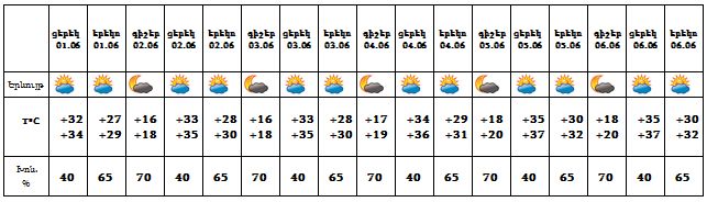 Հունիսի 2-6-ն առանձին շրջաններում կեսօրից հետո սպասվում է կարճատև անձրև և ամպրոպ: Քամին՝ հարավ-արևելյան՝ 3-8 մ/վ: Օդի ջերմաստիճանը հունիսի 1-6-ն աստիճանաբար կբարձրանա 5-6 աստիճանով։
