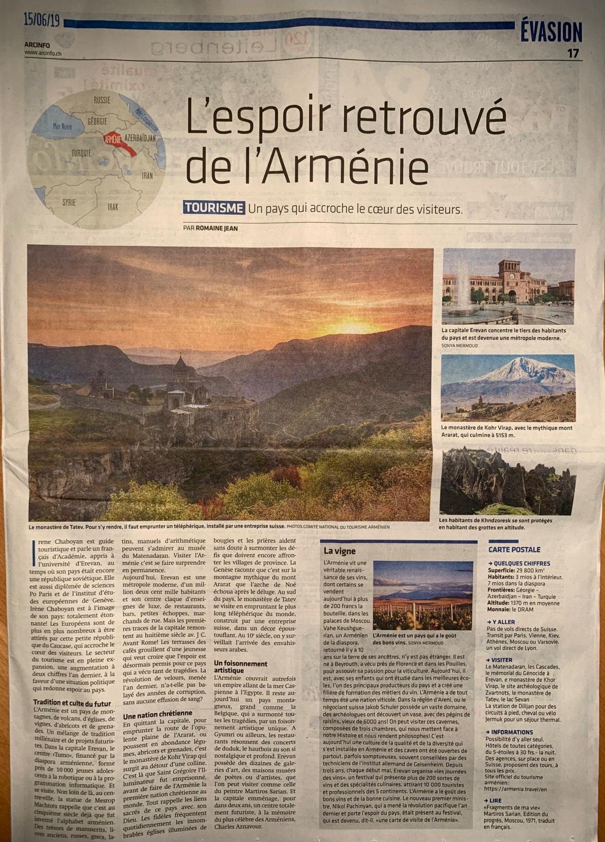 Վալե կանտոնի ամենախոշոր օրաթերթի (ավելի քան 110 000 ընթերցող)` «Le Nouveliste»-ի հունիսի 21-ի համարում մեկ ամբողջական էջի վրա հրապարակվեց համանման «Հայաստանի վերագտնված հույսը» հոդվածը: