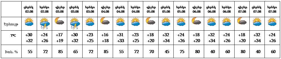 Հայաստանի տարածքում օգոստոսի 2-ի կեսօրից հետո, 3-ին ժամանակ առ ժամանակ շրջանների մեծ մասում սպասվում է կարճատև անձրև և ամպրոպ, ամպրոպի ժամանակ՝ քամու ուժգնացում մինչև 20-25 մ/վ արագություն: Առանձին վայրերում սպասվում է նաև կարկուտ:
