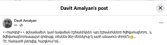 Երգիչ-երգահան, ազատամարտիկ Դավիթ Ամալյանն իր ֆեյսբուքյան էջում գրել է.