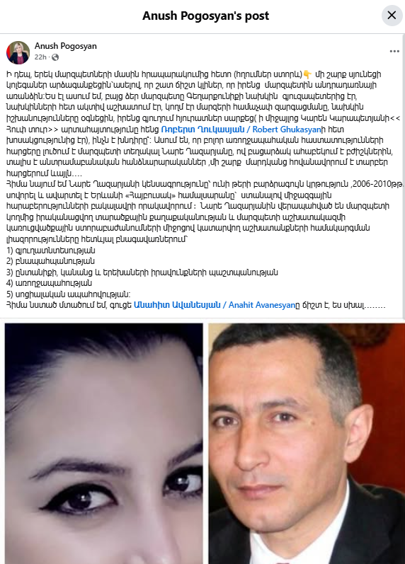 «Առողջության իրավունք» ՀԿ համահիմնադիր, իրավապաշտպան Անուշ Պողոսյանի ֆեյսբուքյան գրառումը․