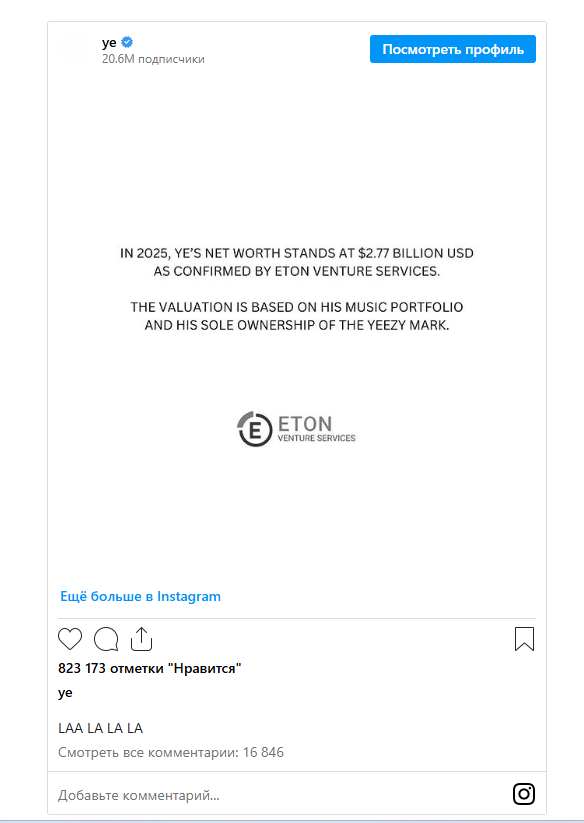 Հինգշաբթի վերջինս Instagram-ում հանդես է եկել՝ պարծենալու իր միլիարդատիրոջ կարգավիճակով, որը, իբր, շնորհվել է բիզնեսի գնահատման Eton Venture Services ընկերության կողմից, որը նրա «մաքուր» կարողությունը գնահատել է 2,77 միլիարդ դոլար: