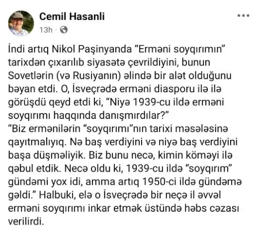 Ադրբեջանագետ Արտյոմ Տոնոյանը գրում է․ «Ցեղասպանության մասին Փաշինյանի հայտարարություններն ավելի մեծ ոգևորություն են առաջացրել Ադրբեջանի պատմաբանների շրջանում, քան երևի Թուրքիայում։