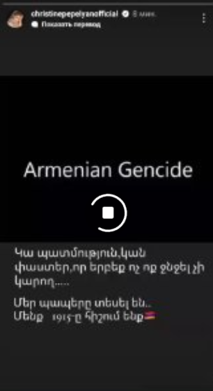 Իր հերթին երգչուհի Քրիստինե Պեպելյանը հոլովակ է հրապարակել իր միկրոբլոգում և նշել․ «Կա պատմություն, կան փաստեր, որոնք երբեք ոչ ոք ջնջել չի կարող։ Մեր պապերը տեսել են։ Մենք հիշում ենք 1915–ը»։