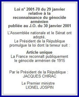 Հիշեցնենք, որ Ֆրանսիայի Ազգային ժողովը և Սենատը 2001 թ-ին ընդունեցին, իսկ Ֆրանսիայի այն ժամանակվա նախագահ Ժակ Շիրակը հրապարակեց օրենքը, ըստ որի՝ «Ֆրանսիան հրապարակայնորեն ճանաչում է 1915 թվականի Հայոց ցեղասպանությունը»։