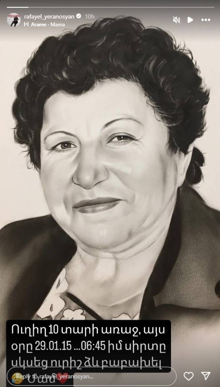 «Ուղիղ 10 տարի առաջ այս օրն իմ սիրտը սկսեց ուրիշ կերպ բաբախել». Ռաֆայել Երանոսյանը հրապարակել է մայրիկի լուսանկարը