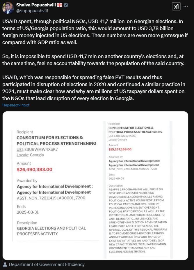 «ԱՄՆ USAID-ն Վրաստանում ընտրությունների վրա ծախսել է 41,7 մլն դոլար՝ քաղաքական կոռուպցիայի միջոցով։ Եթե այն վերահաշվարկենք՝ հիմնվելով ԱՄՆ-ի և Վրաստանի բնակչության հարաբերակցության վրա, դա կկազմի 3,78 միլիարդ դոլար, որը դրսից ծախսվել է ԱՄՆ-ի ընտրությունների վրա։ Այս համեմատությունն ավելի ցայտուն կլինի, եթե հիմք ընդունենք երկրների ՀՆԱ-ն»,- գրել է Պապուաշվիլին սոցցանցերում։