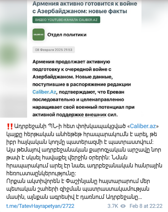 «Ադրբեջանի ՊՆ-ի հետ փոխկապակցված «Caliber.az» կայքը հերթական անհեթեթ հրապարակումն է արել, թե իբր հայկական կողմը պատերազմի է պատրաստվում։