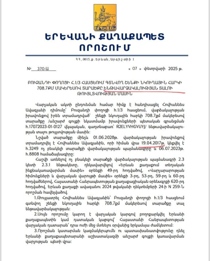 Երևանի ավագանու ընդդիմադիր անդամ Պեդրո Զարոկյանի ֆեյսբուքյան գրառումը․ «Երևանի քաղաքապետարանում համակարգային կոռուպցիայի շարունակման ուղիներից մեկը հիմնված է մի օրենքի վրա, որը թույլ է տալիս քաղաքային կառույցների կողմից օգտագործվող քաղաքային գույքը տրամադրել ենթավարձակալության: Այսպիսով, քաղաքային հիմնարկների տնօրենները սովորաբար մեծ քառակուսի մետրերը վարձակալում են իրենց հարազատներին շատ ցածր գներով, իսկ հարազատները ենթավարձակալում են փոքր քառակուսի մետրերը շուկայական գներով՝ հսկայական անձնական շահույթ ստանալու համար: