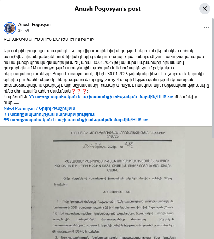 «Առողջության իրավունք» ՀԿ համահիմնադիր, իրավապաշտպան Անուշ Պողոսյանի ֆեյսբուքյան գրառումը. «Քաղաքականություն՝ ընդդեմ ժողովրդի.