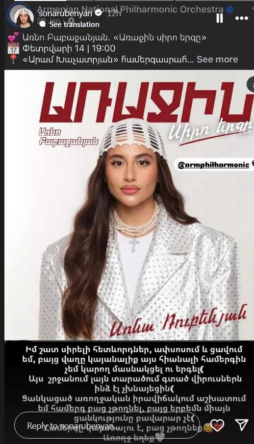 Սիրված երգչուհի Սոնա Ռուբենյանն իր հետևորդներին հայտնել է, որ այսօր նախատեսված համերգին երգել չի կարողանա։