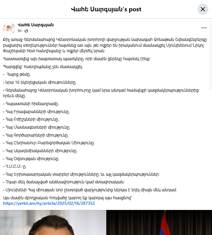 Քիչ առաջ Գերմանահայոց Կենտրոնական խորհրդի վարչության նախագահ Ջոնաթան Շփանգենբերգը բացառիկ տեղեկություններ հայտնեց առ այն, թե ովքեր են իրականում մասնակցել Մյունխենում Նիկոլ Փաշինյանի հետ հանդիպանը և ովքեր մերժել նրան։ Այս մասին Ֆեյսբուքի իր էջում գրում է պատմաբան Վահե Սարգսյանը։