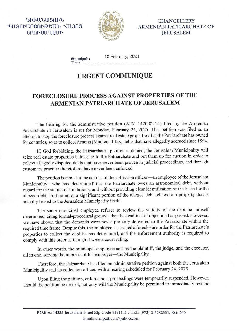 «Երուսաղեմի քաղաքապետարանը ձգտում է բռնագրավել դարեր շարունակ Հայկական Պատրիարքարանին պատկանող գույքը և այն աճուրդի հանել՝ 1994 թվականից ի վեր իբր գոյացած համայնքային պարտքերը հավաքելու համար: