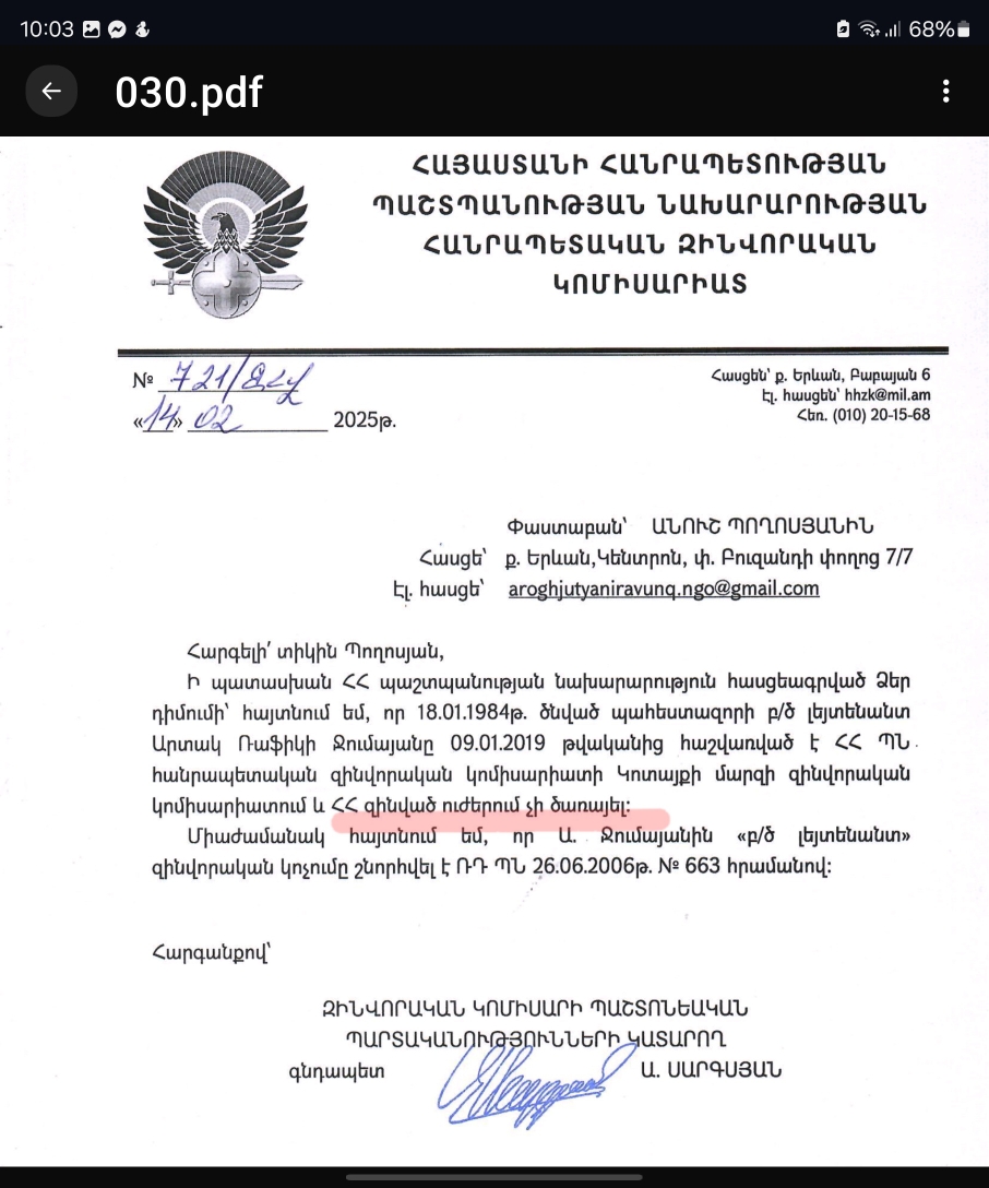 Արտակ Ջումայանը մինչև 2018 թվականը եղել է Ռուսաստանի Դաշնության քաղաքացի, հեղափոխությունից հետո ստացել է ՀՀ քաղաքացիություն, սակայն զորակոչվելու փոխարեն ստացել է պաշտոն, այնուհետ 2019 թվականին, երբ լրացել է 35 տարին, հաշվառվել է Կոտայքի մարզի զինվորական կոմիսարյատում։ Առաջանում են մի քանի հարցեր, որոնց պատասխանը պիտի տան զինվորական դատախազությունւ, Ազգային անվտանգությունը, ՀՀ կառավարությունը։