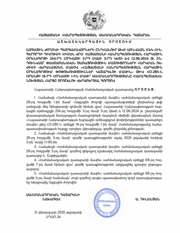 Հիշեցնում եմ, որ ՍԴ դիմումը ՀՀ փաստաբանների պալատի միջնորդությամբ ներկայացվել էր ՀՀ Ազգային ժողովի ընդդիմադիր 31 պատգամավորի կողմից»: