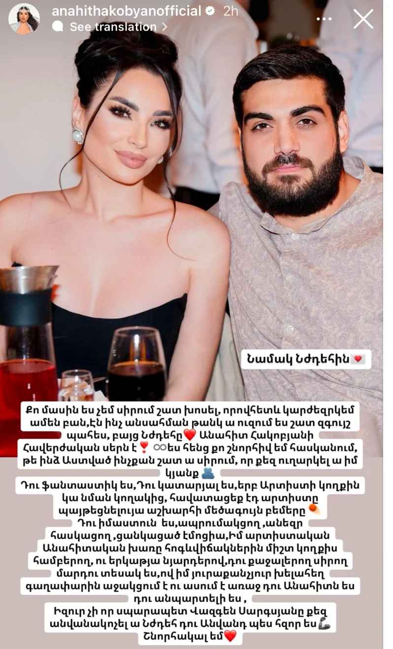 «Նոր ալիք» միջազգային մրցույթի հաղթող, երգչուհի Անահիտ Հակոբյանը իր սոցիալական ցանցերում սիրո խոստովանություն է արել սիրելիին՝ Նժդեհին․