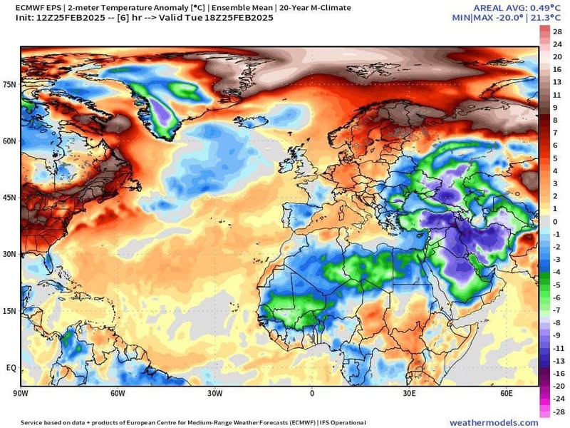 «Հիդրոօդերևութաբանության և մոնիթորինգի կենտրոն» ՊՈԱԿ-ի տնօրեն Լևոն Ազիզյանը գրում է․ «Փետրվարի 25-ի դրությամբ ծայրահեղ ցրտեր են Մերձավոր Արևելքում՝ նորմայից ցածր 13-15 աստիճանով, 180 աստիճան հակառակ պատկերն է Արկտիկայում՝ ծայրահեղ տաք նորմայից բարձր մինչև 20 աստիճան (խոսքը այս ժամանակահատվածի շեղումների մասին է)»։