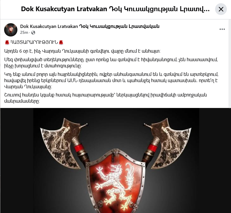 Կոչ ենք անում բոլոր այն հայրենակիցներին, ովքեր անհանգստանում են և գտնվում են արտերկրում, հավաքվել իրենց երկրներում ԱՄՆ դեսպանատան մոտ և պահանջել հստակ պատասխան․ որտե՞ղ է Վարդան Ղուկասյանը։