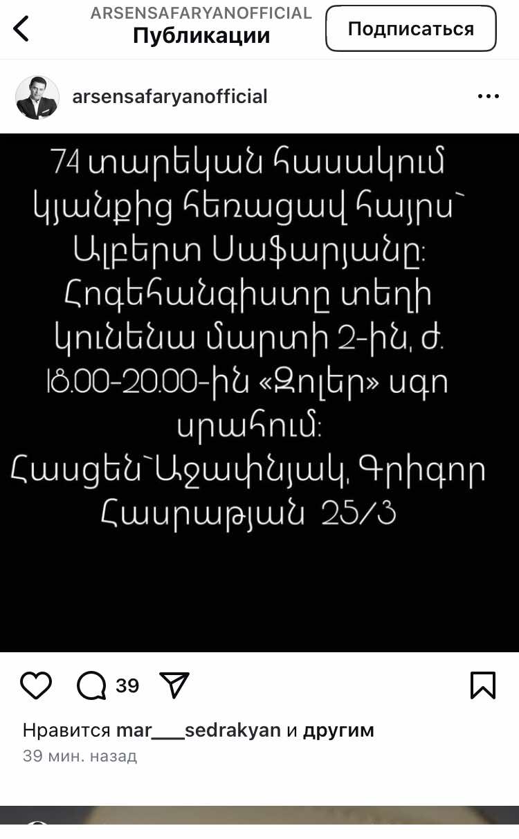 74 տարեկանում մահացել է երգիչ Արսեն Սաֆարյանի հայրը՝ Ալբերտ Սաֆարյանը: