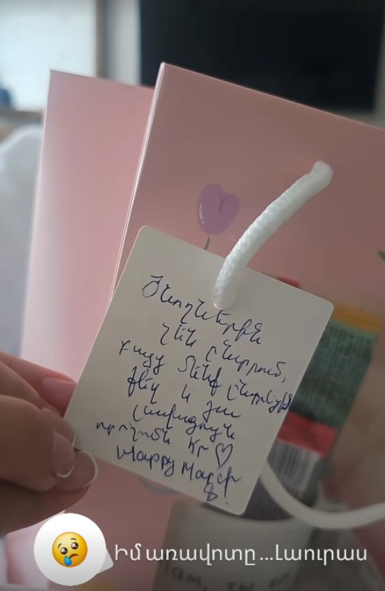 Դերասանուհի Անահիտ Կիրոկոսյանը ինստագրամի իր էջի սթորի բաժնում հրապարակել է դուստրերի՝ Լաուրայի և Աննայի շնորհավորանքը Մարտի 8–ի կապակցությամբ: