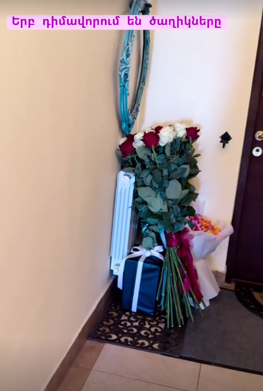 Համապատասխան կադրերում երևում են ծաղկեփնջերն ու նվերի տուփը դերասանուհու տան դռան առջև։
