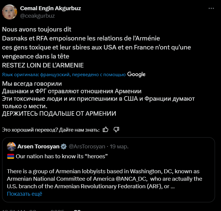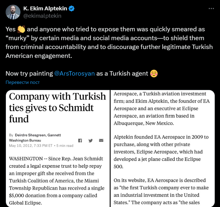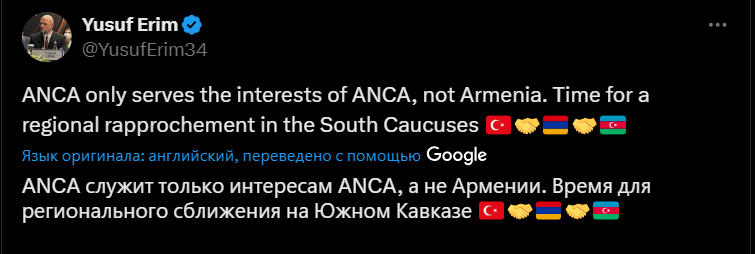 «ANCA-ն սպասարկում է միայն ANCA-ի շահերը, ոչ թե Հայաստանի։ Հարավային Կովկասում տարածաշրջանային մերձեցման ժամանակն է»,– Թորոսյանի գրառման մեկնաբանությունների բաժնում գրել է թուրք իշխանամետ լրագրող Յուսուֆ Էրիմը։