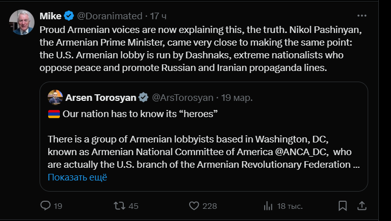 Այսպես, Հադսոնի հետազոտական ինստիտուտից ադրբեջանամետ վերլուծաբան Մայքլ Դորանը կիսվել է Թորոսյանի գրառմամբ և նշել․ «Հայկական հպարտ ձայները հիմա բացատրում են սա՝ ճշմարտությունը։ Հայաստանի վարչապետ Նիկոլ Փաշինյանը շատ մոտ էր նույն միտքն ասելուն. ԱՄՆ հայկական լոբբին ղեկավարում են դաշնակցականները՝ ծայրահեղ ազգայնականներ, ովքեր դեմ են խաղաղությանը և քարոզում են ռուսական և իրանական քարոզչական գծերը»: