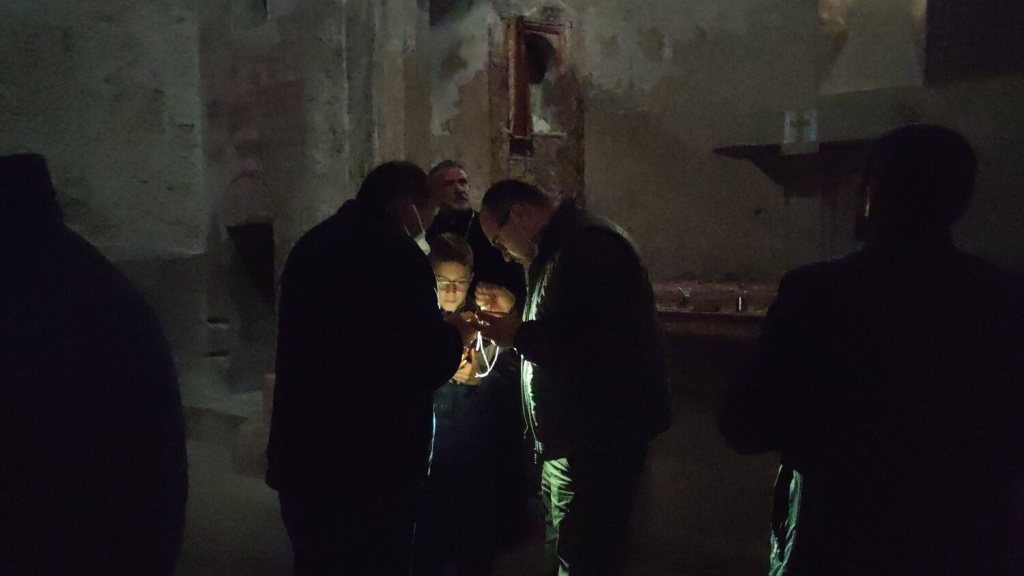 Несколько человек быстро принесли тяжёлую каменную купель. Крещаемые в темноте, подсвечивая телефонными фонариками, продевали тесёмки через ушки скромных деревянных крестиков, готовились. Отец Ованес, прежде чем приступить к таинству крещения, сказал прихожанам: «Я был здесь и я останусь здесь». Духовное войско настоятеля храма пополнилось желающими остаться вместе с ним, охранять святыню и молиться.