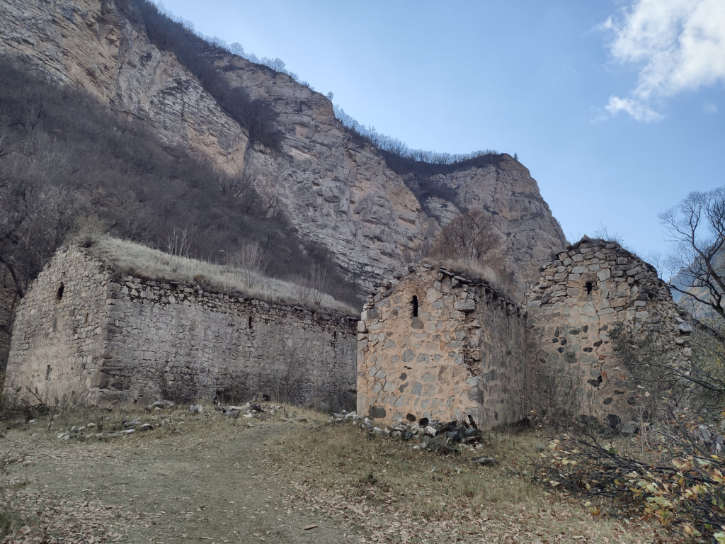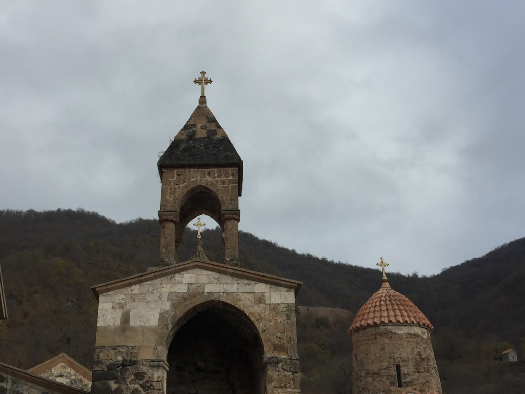 Помню, не доезжая нескольких километров до армянской святыни, мы остановились на берегу реки Тартар, рядом с мостиком, который вёл на другой берег. Там, в зарослях леса, прятался ещё один монастырь — Святой Богородицы, или Девичья пустынь. Этот уникальный комплекс, состоящий из девяти сохранившихся до наших дней построек, самая древняя из которых датируется 1174 годом, скрыт от глаз большинства путешественников. Мало кто замечает его с дороги, а вывеска едва заметна. Скорее всего, мы видели его в последний раз. Что можно сказать о судьбе таких малоизвестных монастырей, когда азербайджанцы на глазах у всего мира уничтожали другие армянские памятники, многие из которых, к слову, находились под защитой ЮНЕСКО?