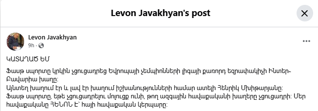 «Կատաղած եմ․ Ֆասթ սպորտը կրկին չցուցադրեց Եվրոպայի չեմպիոնների լիգայի քառորդ եզրափակիչի Ինտեր֊Բավարիա խաղը»,– Ֆեյսբուքի իր էջում գրել է արձակագիր Լևոն Ջավախյանը։