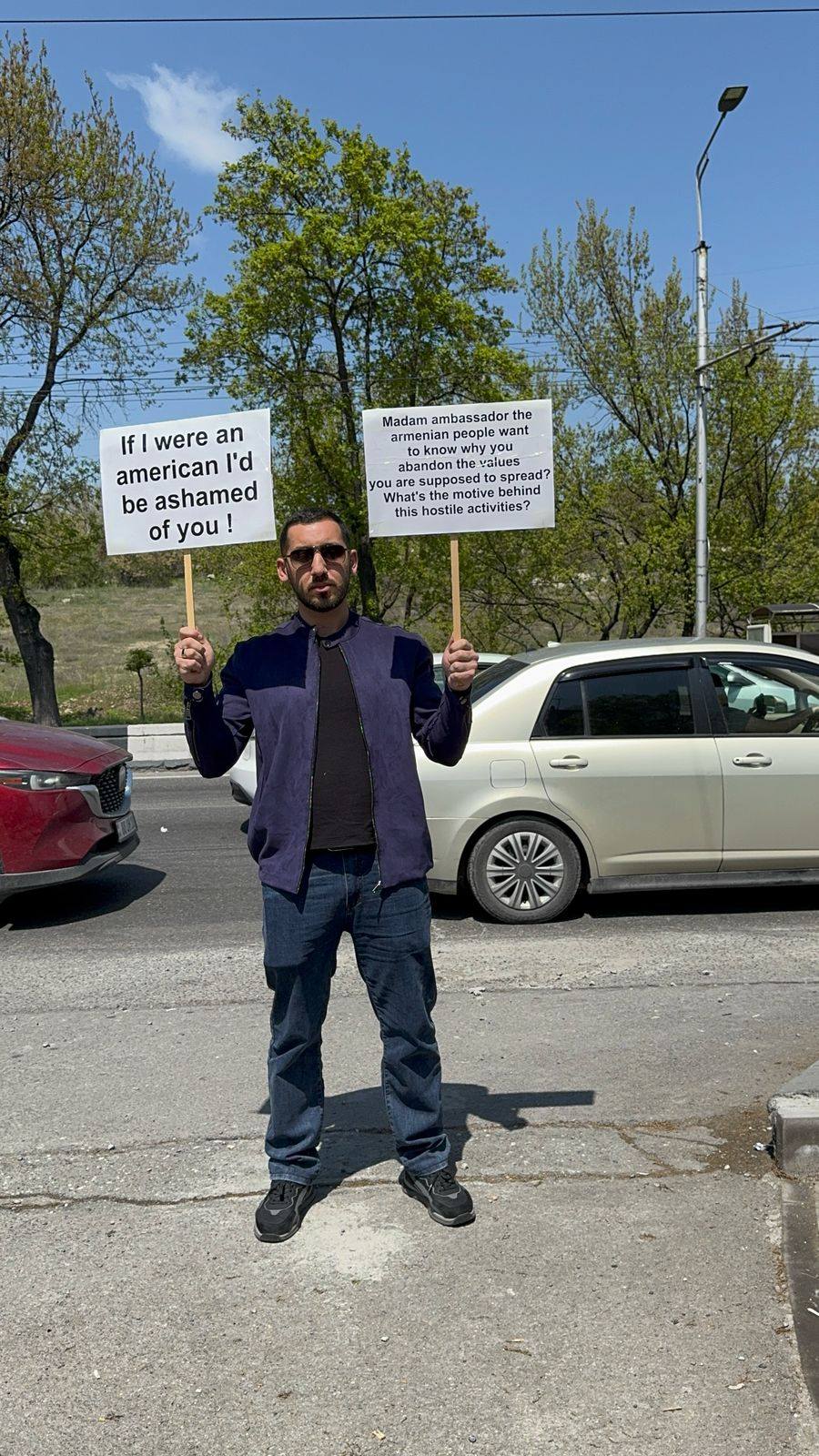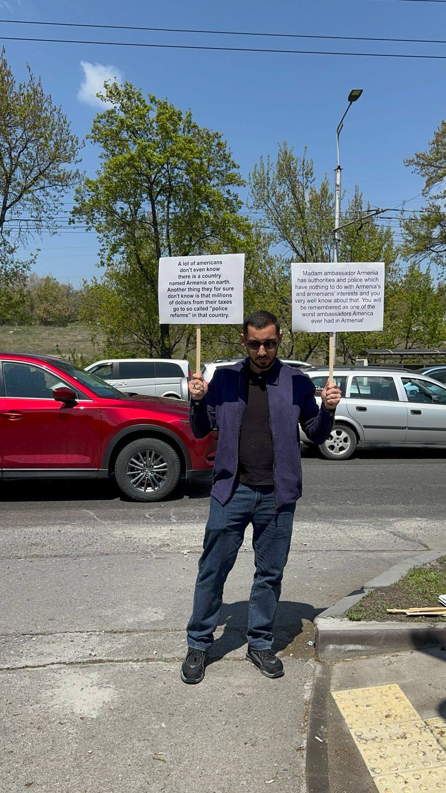 Ավարտեցի իմ ակցիան ԱՄՆ դեսպանատան առաջ։ Լուռ, իմ ասելիքը թղթի վրա տպած կանգնեցի 50 րոպե։ Այս մասին իր ֆեյսբուքյան էջու գրել է ակտիվիստ Սամվել Վարդանյանը։