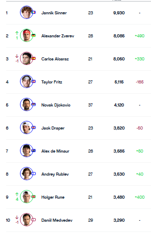 Գերմանացի թենիսիստ Ալեքսանդր Զվերևը բարձրացավ երկրորդ տեղ։ Կարլոս Ալկարասը նահանջեց երրորդ տեղ՝ գերմանացուն զիջելով ընդամենը 35 միավորով: Հոլգեր Ռունը նույնպես բարձրացել է չորս հորիզոնականով՝ ընդհանուր վարկանիշում զբաղեցնելով իններորդ տեղը։
