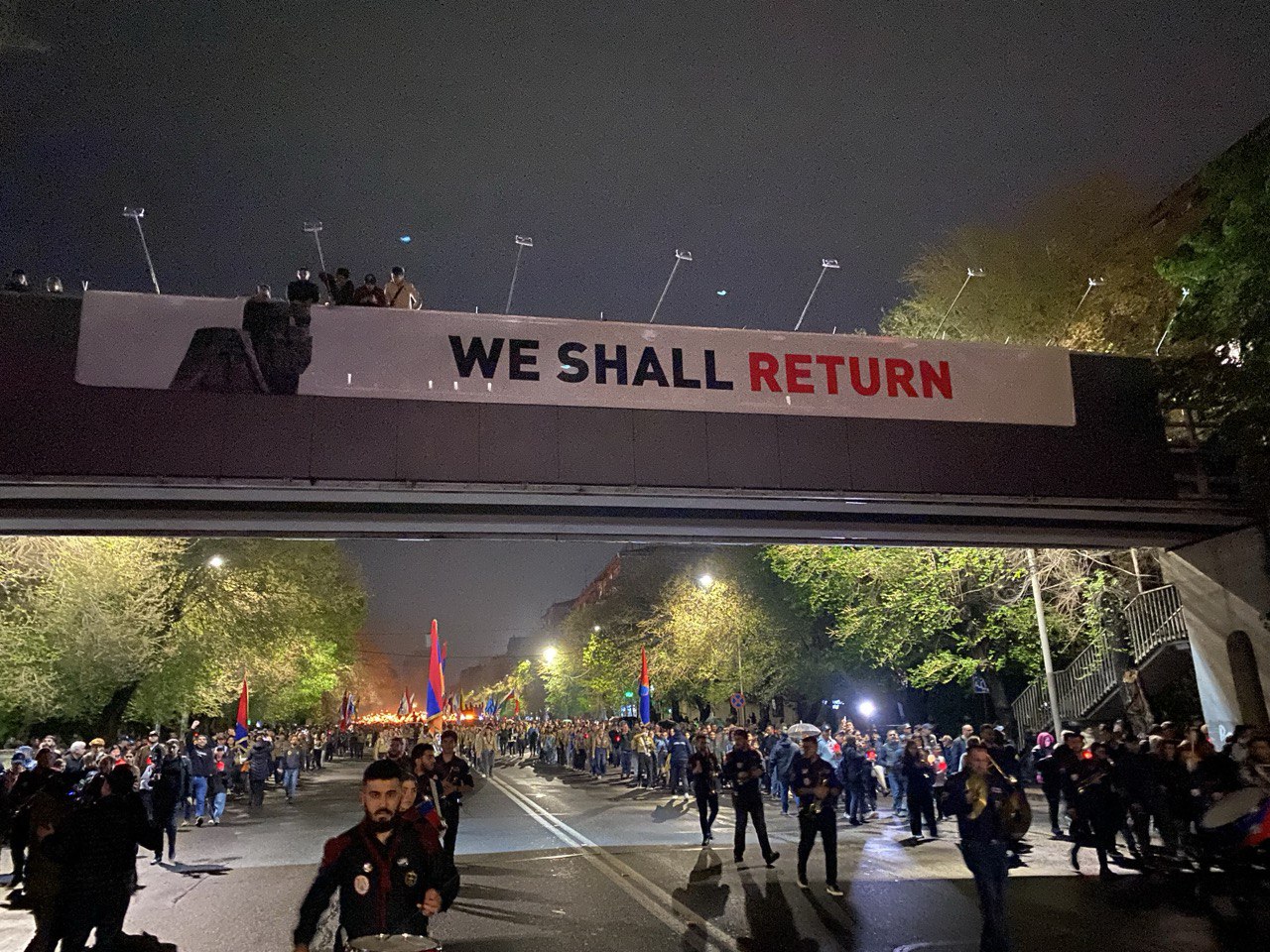 «Պահանջատիրական ջահերով երթի ընթացքում , երբ երթը հասավ Երևանի Կիևյան պողոտա, վերգետնյա հետնյոտննային անցման կամրջից երթի մասնակից մի խումբ երիտասարդներ, կախեցին «Վերադարձ լինելու է» արցախցիների իրավունքը խորհրդանշող մեծադիր պաստառ»։