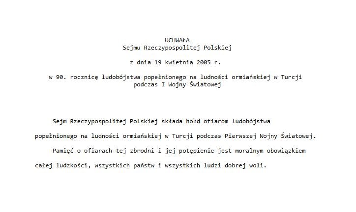 «Լեհաստանի Հանրապետության Սեյմը հարգանքի տուրք է մատուցում Առաջին համաշխարհային պատերազմի ժամանակ Թուրքիայում հայ բնակչության նկատմամբ կատարված ցեղասպանության զոհերի հիշատակին։