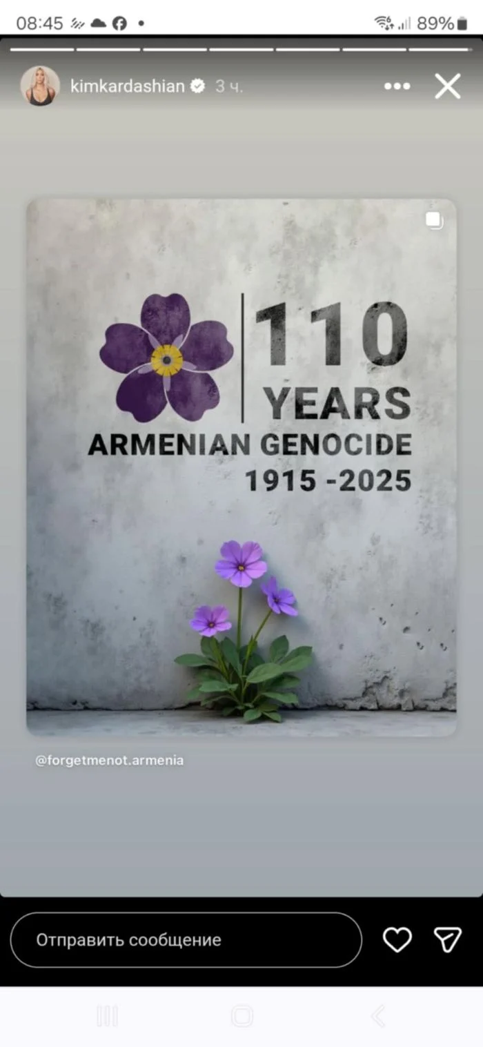Ամերիկահայ հեռուստաաստղ Քիմ Քարդաշյանն իր ինստագրամյան էջի «սթորի» բաժնում հիշատակել է Հայոց ցեղասպանության 110-ամյակը։