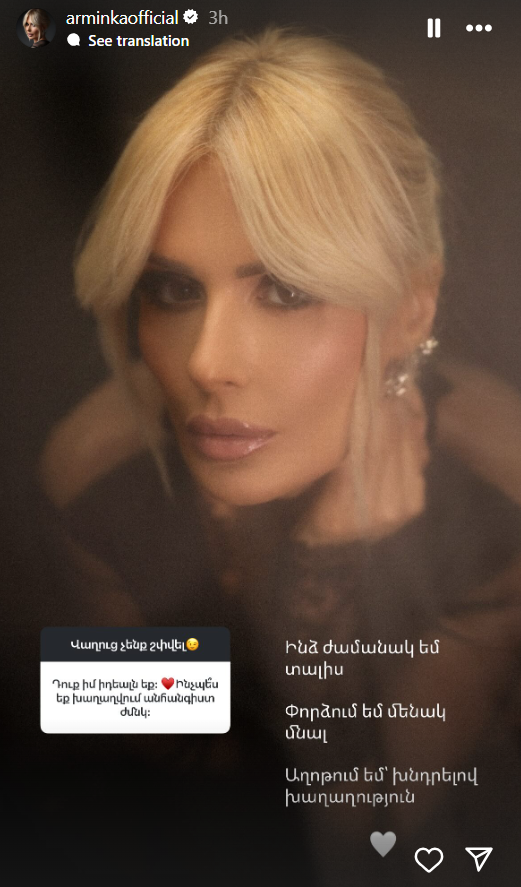 Հարցին, թե ինչպես է խաղաղվում անհանգիստ ժամանակ՝ Արմինկան պատասխանել է․ «Ինձ ժամանակ եմ տալիս, փորձում եմ մենակ մնալ, աղոթում եմ՝ խնդրելով խաղաղություն»։