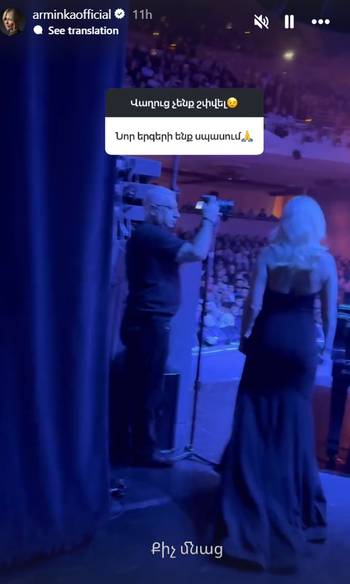 Նա նաև խոստացել է նոր երգ ներկայացնել․ «Քիչ մնաց»,– նշել է երգչուհին՝ Ինստագրամի իր էջի «սթորի» բաժնում արձագանքելով երկրպագուին։