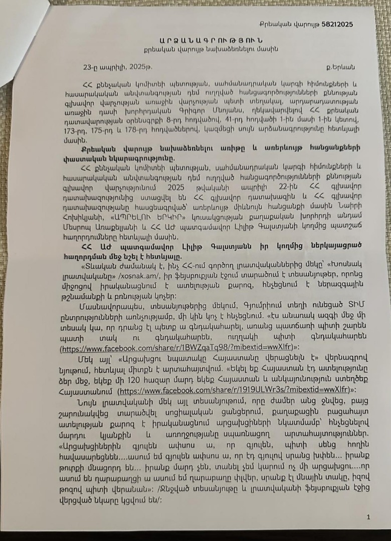 «Xosnak.am լրատվականի կողմից արցախահայության դեմ ատելության խոսք տարածելու, բռնության կոչեր հնչեցնելու և հանրության շրջանում թշնամանքի մթնոլորտ ձևավորելու համար օրերս ՀՀ գլխավոր դատախազ Տկն․ Աննա Վարդապետյանին էի ներկայացրել հաղորդում հանցագործության մասին։