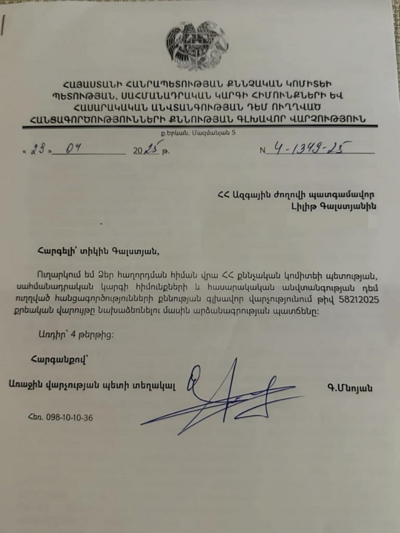 Ահա, ստացել եմ ՀՀ քննչական կոմիտեի պետության, սահմանադրական կարգի հիմունքների և հասարակական անվտանգության դեմ ուղղված հանցագործությունների քննության գլխավոր վարչության պատասխանը՝ տվյալ լրատվականի նկատմամբ քրեական վարույթ նախաձեռնելու մասին։
