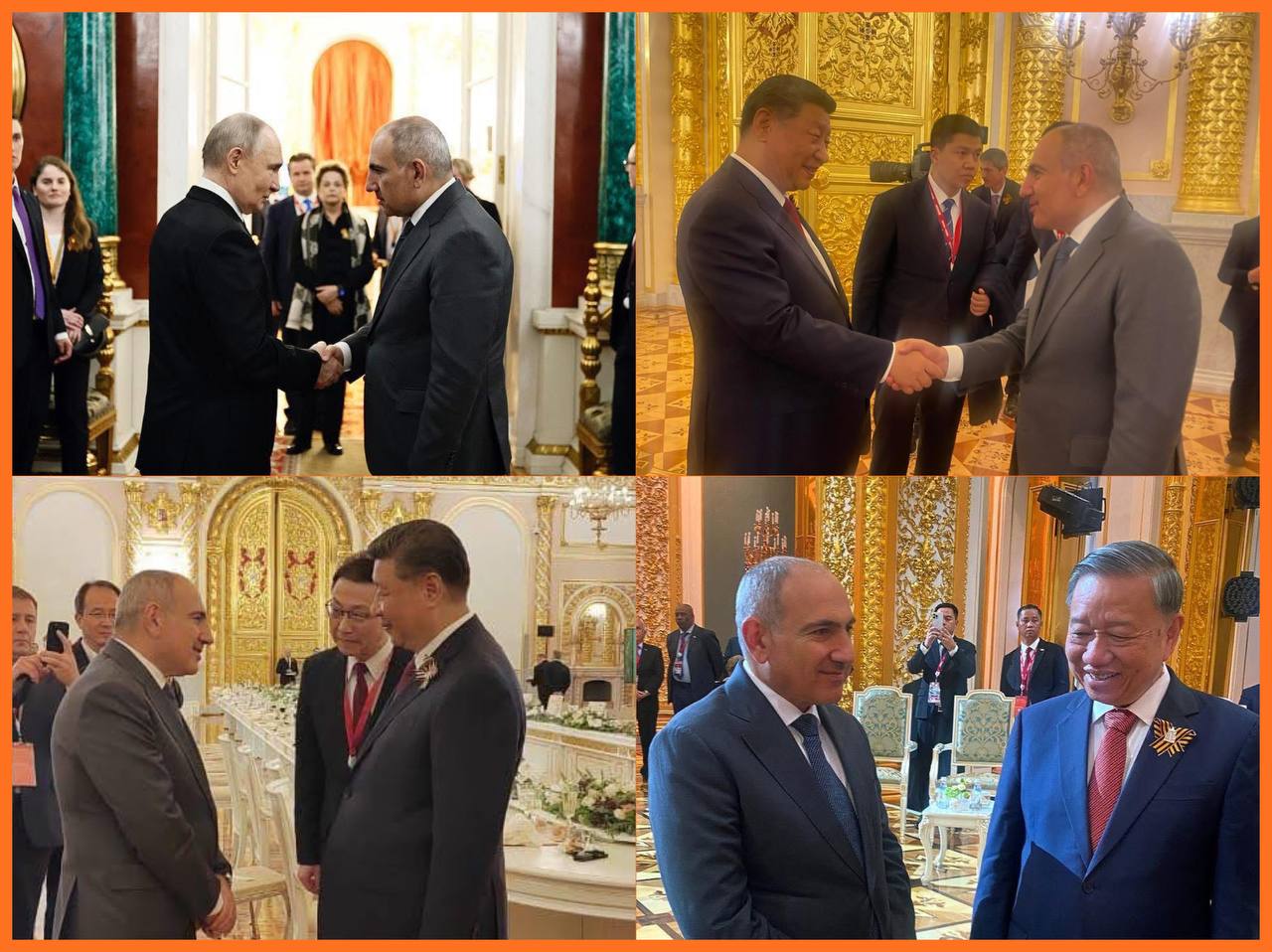 Հայրենական մեծ պատերազմում տարած հաղթանակի 80-ամյակի տոնակատարությունների շրջանակում, ի պատիվ օտարերկրյա պատվիրակությունների ղեկավարների ընթրիքի ժամանակ, Նիկոլ Փաշինյանը ոչ ֆորմալ շփումներ է ունեցել արտերկրի գործընկերների հետ: