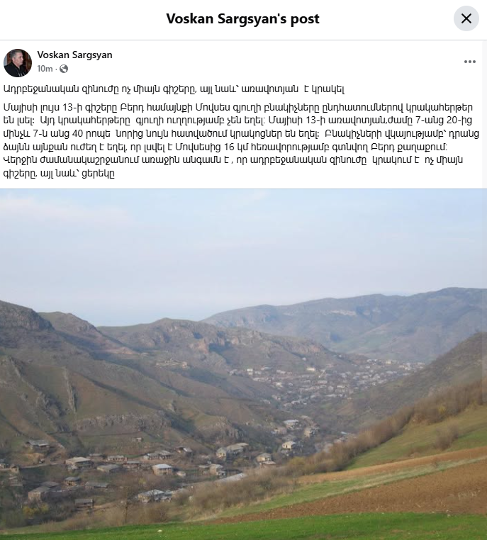 նա նաեւ նշել է. «Մայիսի 13-ի առավոտյան, ժամը 7-անց 20-ից մինչև 7-n անց 40 րոպե նորից նույն հատվածում կրակոցներ են եղել: Դրանց ձայնն այնքան ուժեղ է եղել, որ լսվել է Մովսեսից 16 կմ հեռավորությամբ գտնվող Բերդ քաղաքում։