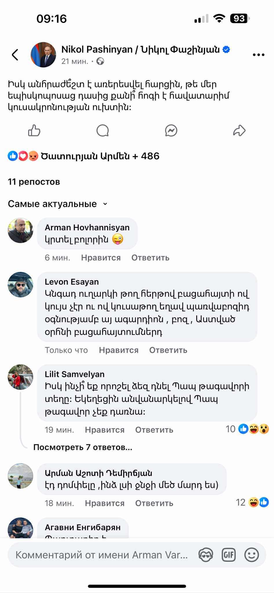 Իսկ անհրաժե՞շտ է առերեսվել հարցին, թե մեր եպիսկոպոսաց դասից քանի՞ հոգի է հավատարիմ կուսակրոնության ուխտին։ Այս մասին իր ֆեյսբուքյան էջում գրել է ՀՀ վարչապետ Նիկոլ Փաշինյանը: