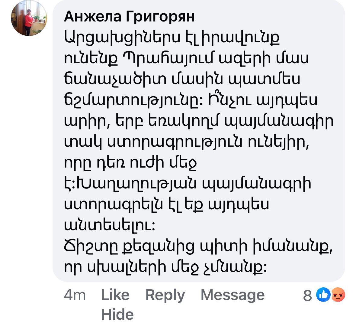 Արցախցի Անժելա Գրիգորյանը գրել է․ «Արցախցիներս էլ իրավունք ունենք Պրահայում ազերի մաս ճանաչացիդ մասին պատմես ճշմարտությունը։ Ինչո՞ւ այդպես արեցիր, երբ եռակողմ պայմանագրի տակ ստորագրություն ունեիր, որը դեռ ուժի մեջ է։ Խաղաղության պայմանագրի ստորագրելն էլ եք այդպես անտեսելու։ Ճիշտը քեզնից պետք է իմանանք, որ սխալների մեջ չմնանք»։